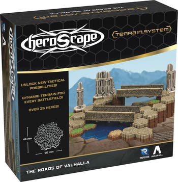 HEROSCAPE: ROADS OF VALHALLA TERRAIN EXPANSION - Much of Valhalla’s infrastructure has crumbled over the past decade of unending conflict. While monuments and works of art have long since collapsed, the Valkyrie generals still maintain a network of old stone roads and bridges to keep their armies supplied—for in Valhalla, all roads lead to WAR. Add speed and strategy to your battlefield maps! Includes road terrain tiles that boost movement and short walls that attach to create custom bridges–perfect for controlling the flow of battle and building epic new maps. This terrain expansion is fully compatible with all Heroscape terrain. Mix and match this expansion with any terrain for seamless integration into your collection. This is add-on content. A Battle Box and/or Master Set is required for Heroscape gameplay. EXPANSION: Add on content for the Heroscape Miniatures Game - Battle Box or Master set is required to play - contains 16 1-hex Road Terrain Tiles, 2 5-hex Road Terrain Tiles and 4 Short Walls.