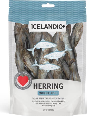 100% Pure Icelandic+ Herring Whole Fish Dog Treats. News Alert: Is your dog on a Grain Free Diet? If so, then per the FDA your dog needs Taurine! Luckily, our Herring Dog Treats are loaded with naturally occurring Taurine. Stock up today. Your dog will love the irresistible taste and satisfying crunch of our nutritious and natural Herring Whole Fish dog treats, made from one single ingredient—whole Herring! The Herring Dog Treats are air-dried within FDA, USDA, EU, and MAST standards. Our 100% edible and digestible Herring dog treats promote healthy skin and coat with Omega-3 fatty acids. They also reduce plaque and tartar build-up, making them good for your dog’s teeth. Plus, since these treats feature a single protein source, they’re a smart choice for dogs with food sensitivities. Pure fish treats for dogs. Contains Herring (Clupea Harengus Membras). For healthy skin and shiny coat. Full of Omega-3 fatty acids. Contains Taurine to help keep a healthy heart. Pure Fish. Nothing else. Enjoy peace of mind. Our fish treats are air-dried within FDA, USDA, EU, and MAST standards and regulatio. 100% sustainably fished. 100% edible and digestible. 100% natural—no additives, no preservatives and no supplements. 100% single ingredient dog treat—just fish, nothing else! 100% Viking—air-dried as the Vikings did in 900 A.D.For freshness and convenience, our fish are packaged in a stand-up resealable bag. Each package contains net wt. 3.0 oz. or 12.0 oz. of Herring Whole Fish. Each fish is about 3-4" in length.