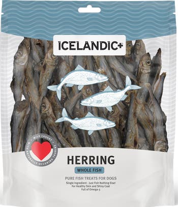 100% Pure Icelandic+ Herring Whole Fish Dog Treats. News Alert: Is your dog on a Grain Free Diet? If so, then per the FDA your dog needs Taurine! Luckily, our Herring Dog Treats are loaded with naturally occurring Taurine. Stock up today. Your dog will love the irresistible taste and satisfying crunch of our nutritious and natural Herring Whole Fish dog treats, made from one single ingredient—whole Herring! The Herring Dog Treats are air-dried within FDA, USDA, EU, and MAST standards. Our 100% edible and digestible Herring dog treats promote healthy skin and coat with Omega-3 fatty acids. They also reduce plaque and tartar build-up, making them good for your dog’s teeth. Plus, since these treats feature a single protein source, they’re a smart choice for dogs with food sensitivities. Pure fish treats for dogs. Contains Herring (Clupea Harengus Membras). For healthy skin and shiny coat. Full of Omega-3 fatty acids. Contains Taurine to help keep a healthy heart. Pure Fish. Nothing else. Enjoy peace of mind. Our fish treats are air-dried within FDA, USDA, EU, and MAST standards and regulations. 100% sustainably fished. 100% edible and digestible. 100% natural—no additives, no preservatives and no supplements. 100% single ingredient dog treat—just fish, nothing else! 100% Viking—air-dried as the Vikings did in 900 A.D. For freshness and convenience, our fish are packaged in a stand-up resealable bag. Each package contains net wt. 3.0 oz. or 12.0 oz. of Herring Whole Fish. Each fish is about 3-4" in length. Dried and Packed in Iceland.
