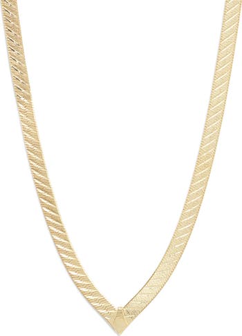 A sterling silver herringbone chain necklace fashioned in an elegant V brings liquid shine to your day-to-night looks with a glossy 18-karat gold finish.