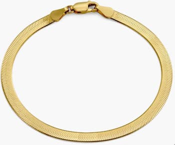 You've been looking for that perfect bracelet, and this is it! We love the versatility of the chic Herringbone Engraved Slim Bracelet in Gold Vermeil. Wear it with any outfit! How To Wear It? This will look great stacked or worn alone. We also love to pair it with another gold necklace for women from our 14k gold bracelets collection. This bracelet is made of gold vermeil. Jewelry Care Tip: Herringbone chains are delicate and elegant, which means tugging or pulling can damage them. To ensure you enjoy your necklace, be careful, gentle and avoid wearing it while exercising, sleeping, or showering.