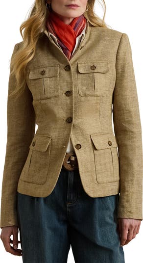 A tailored fit further polishes a classic herringbone jacket popped with prominent pockets and made from pure linen.
