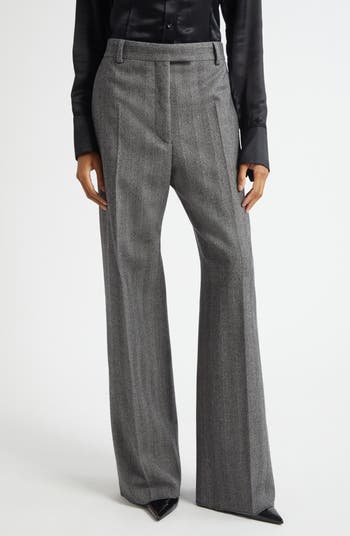 A dimensional herringbone weave brings sartorial polish to these high-waist pants tailored in a creased, wide-leg silhouette from a virgin-wool blend.