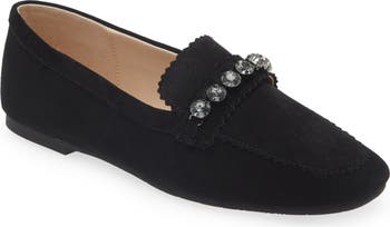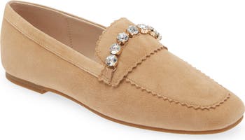 A line of starry crystals enriches an apron-toe loafer constructed from soft, comfortable suede.