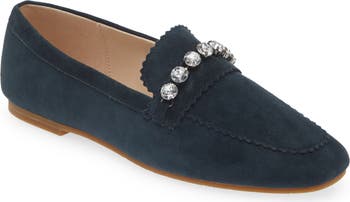 A line of starry crystals enriches an apron-toe loafer constructed from soft, comfortable suede.