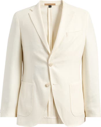 A subtly textured blend of wool, silk and linen relaxes a pale-white sport coat that's tailored in a slim fit and fitted in the waist for a crisp, smart silhouette. Front patch pockets and pick stitching around the lapels add traditional detailing to complement any elevated-casual look.