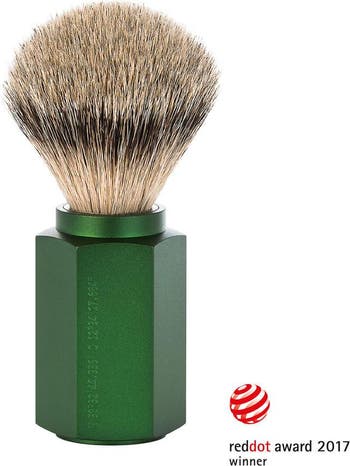 Six corners - symmetrical beauty: The HEXAGON brush sits perfectly in any hand due to its hexagonal form. Designed by Mark Braun Shaving brush with silvertip badger, replaceable head Ring size M: 21 mm Handles made of anodised aluminum, forest The HEXAGON series - Precision implements, perfect designFor the HEXAGON range of products, MÜHLE has collaborated with renowned Berlin designer Mark Braun. The results are the finest shaving implements, expertly proportioned. The hexagonal profile of each of these products combines contemporary design with traditional, and thoroughly practical, elements to ensure ergonomics, grip and functionality. A design approach for which Mark Braun has already won many awards.Featuring matt metallic handle finishes and understated engraving detail, these products are MÜHLE through and through.The Brushhead - Silvertip badger Only the best, carefully selected badger hair is used for these purely handcrafted shaving brushes. The precious natural material is particularly soft and flexible. The fine, conically tapering hairs possess the ability to retain a large amount of water and produce a dense, creamy lather. Another sign of quality is the even black band running horizontally through the predominantly silvery gleaming hair.This premium product is manufactured using historical tools in an artisan procedure mastered by only a few specialists worldwide. The semi-circular shape of the brush head is created by hand when binding the brush. The fine tips therefore do not require trimming and the natural softness of the hair is retained. Measures Handle: 55 mm x 32 mmWeight: 127 g