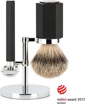 3-part shaving set designed by Mark Braun, handles made of anodised aluminum, colour graphite: Shaving brush with Silvertip Badger, replaceable head Ring size M: 21 mm Safety razor, compatible with classic razor blades Stand made of metal, chrome-plated The HEXAGON series - Precision implements, perfect designFor the HEXAGON range of products, MÜHLE has collaborated with renowned Berlin designer Mark Braun. The results are the finest shaving implements, expertly proportioned. The hexagonal profile of each of these products combines contemporary design with traditional, and thoroughly practical, elements to ensure ergonomics, grip and functionality. A design approach for which Mark Braun has already won many awards.Featuring matt metallic handle finishes and understated engraving detail, these products are MÜHLE through and through.The Brushhead - Silvertip badger Only the best, carefully selected badger hair is used for these purely handcrafted shaving brushes. The precious natural material is particularly soft and flexible. The fine, conically tapering hairs possess the ability to retain a large amount of water and produce a dense, creamy lather. Another sign of quality is the even black band running horizontally through the predominantly silvery gleaming hair. This premium product is manufactured using historical tools in an artisan procedure mastered by only a few specialists worldwide. The semi-circular shape of the brush head is created by hand when binding the brush. The fine tips therefore do not require trimming and the natural softness of the hair is retained. The Razorhead - Classic razor blade For generations, the safety razor has been regarded as a stylish classic which can even shave edges with precision.Even if the open blade does demand a little respect at first: After a brief familiarisation period, and guided by a steady hand, it produces a very close shave and a lasting result. Unlike modern blade systems, the head of the safety razor does not move. The blades are replaced by unscrewing the cap. They can be purchased from us and by retailers everywhere. We recommend our rust-proof MÜHLE razor blades which are the perfect match for our safety razors. Measures Shaving brush handle dimensions: 55 mm x 32 mmShaving brush weight: 127 gSafety razor dimensions: 102 mm x 12 mmSafety razor weight: 67 gTotal dimensions: 130 x 95 mmTotal weight: 427 g