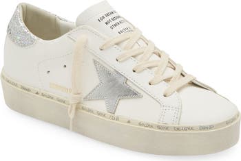 A metallic star and glittery counter dazzle on a leather sneaker detailed with a prescuffed platform sole and handwritten logo lettering around the foxing.