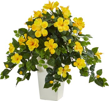 Instantly create a brilliant focal point of yellow sunshine with this artificial hibiscus plant. The yellow and green hibiscus spills over the sides of the simple white tower planter. This is a perfect addition that brightens any room.