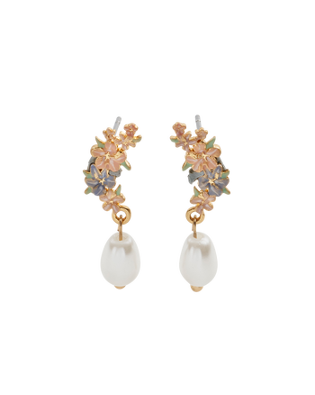 Adorn your ears with petals symbolic of passion. These gold-plated drop earrings feature hand-painted enamel hibiscus flowers in soft pastel colours punctuated by perfect faux pearls.