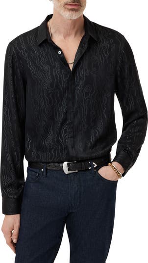 Topographic-inspired lines elevate this button-up cut from a fine fabric that gives this style a supple drape that's nearly as intriguing as its allover pattern.