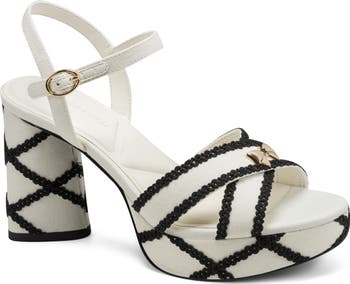 Decorative stitching highlights the mesh straps and soaring height of a chic sandal secured by a slender strap at the ankle