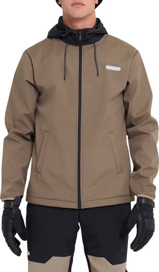 This soft shell jacket with adjustable cords at the hood and hem look in the heat while you out in the elements.