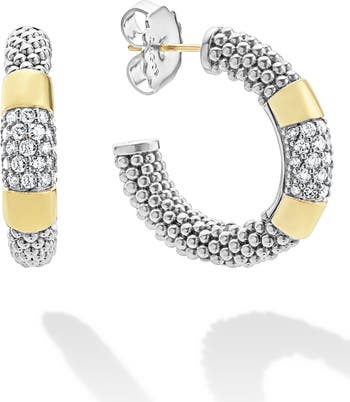 Signature Caviar beading flanks the brilliant diamond pavé sparkling at the center of these sterling silver hoop earrings wrapped with 18-karat gold.