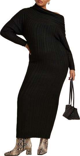 - Embrace modern elegance in this maxi sweater dress featuring an asymmetric high collar with a soft drape. A body-skimming fit and ribbed knit construction elongate the silhouette beautifully.