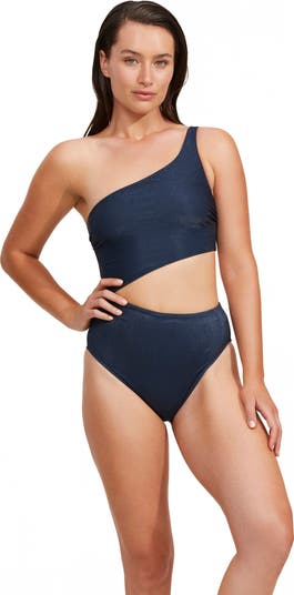 The High End One Shoulder Cut Out One Piece offers a bold, modern silhouette with a sleek waist cutout. Designed with removable soft cups, metallic fabric, and full lining, this swimsuit provides both style and support with a shimmering finish.