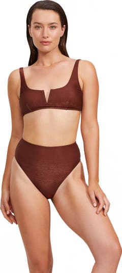 The High End V Wire Bikini Top combines sleek structure with a luxe finish. Designed with removable soft cups, adjustable straps, and metallic fabric, it pairs perfectly with the High End swim bottom collection for a chic, coordinated look.