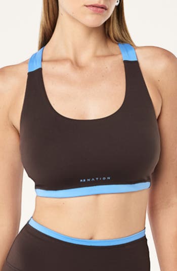 A shoulder-freeing racerback enhances the easy movement of this stretchy sports bra made with removable soft cups.