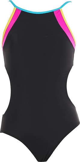 This striking black maillot features a modern high-neck silhouette, meticulously defined by electric pink and sunshine yellow panels at the shoulders. Detailed with a crisp cyan blue trim at the neckline and trendy side cutouts, this one-piece is engineered for both standout style and maximum performance during every splash.