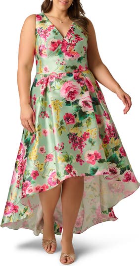 Structured seams shape the bodice of this stunning fit-and-flare dress covered in an enchanting floral pattern and balanced by a voluminous high-low hem.