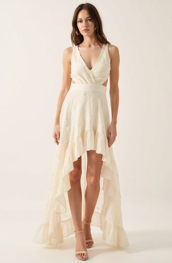 This dreamy high-low dress features a soft wrap-style bodice with a deep V neckline and subtle cutouts at the waist for a feminine, modern touch. Delicate ruffle trim cascades down the hem, adding graceful movement and charm. The embroidered details throughout the skirt elevate the airy texture, making it a romantic choice for special occasions or warm-weather getaways.