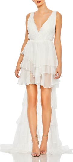 Make a statement in this gorgeous chiffon ruffled high-low gown, featuring a built-in bodysuit for a flattering, seamless fit and dramatic flair.