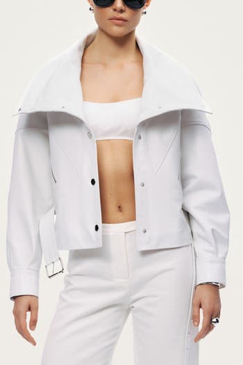 A statement jacket defined by its sculptural high neckline and sharp tailored construction, combining modern edge with a clean, structured silhouette for elevated outerwear styling.