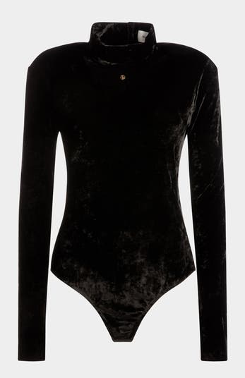 In a crushed velvet texture, this high neck bodysuit is a slick, elevated take on a well-known wardrobe piece. It's seen with lightly padded shoulders, long sleeves, a high cut at the thighs, and a discreet gold tone Bally Emblem detail to the front.
