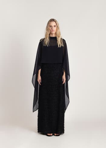 Long sheer cape with neck detail.