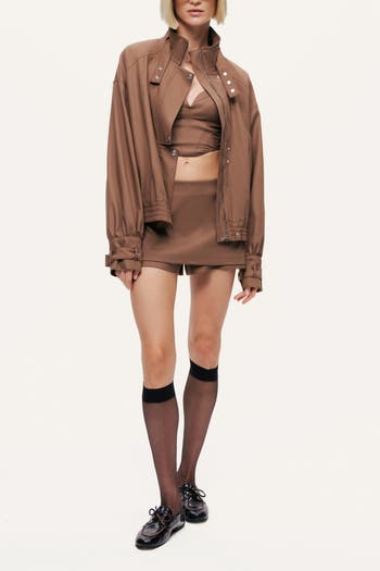 Crafted from smooth woven fabric, this relaxed-fit cropped jacket blends casual comfort with a clean, modern silhouette. The high neck features a snap-button closure for a structured finish, complemented by a front zip fastening for easy layering. Long sleeves with buttoned cuffs add a refined touch, while the elasticated hem creates a subtle cinched shape. A versatile everyday piece that pairs effortlessly with denim, joggers, or tailored trousers for elevated off-duty style.