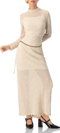 Elegant long dress featuring a high neckline, long sleeves, and a side slit, crafted in a natural knit.