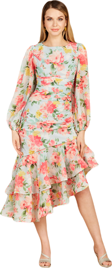 Long blouson sleeve midi dress with an asymmetrical ruffled hemline in a floral pattern. Features a high neckline but is a party in the back with lace-up details!