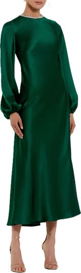 Elevate your look with our High Neck Long Sleeve Crystal Detail Dress, crafted from luxurious satin. The puff sleeves add drama, perfect for any formal occasion.