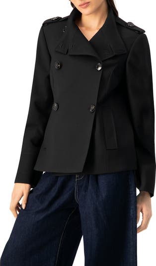 Military-style coat with a high collar, double-breasted design, and pockets.