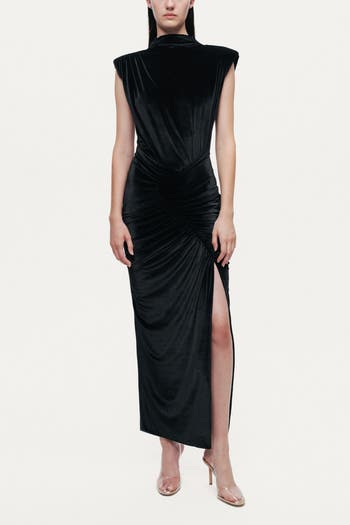 Sophisticated yet striking, this midi dress features a mock neck with extended shoulders and artful ruching that defines the waist. The gathered drape flows into an asymmetric thigh slit, adding a touch of allure to its sculpted silhouette. Finished with a back neck keyhole and concealed zip closure, it’s a refined statement piece for both evening and occasion wear.