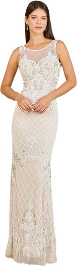 Beaded long sheath gown. The gown features beaded illusion neckline with mid v-back. Had a nude lining which contrasts the ivory tulle