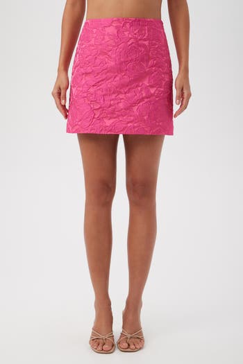High rise mini skirt in a metallic geometric jacquard with a side zipper