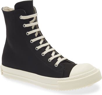 Cotton twill kicks up the casual appeal of a towering high-top sneaker that's set in a glossy-white cupsole and streamlined with a side zipper.