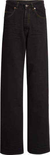 High-waisted five-pocket jeans are fashioned with a baggy fit and wide legs, while the V-cut waistline takes a slight dive in front. They're finished with subtle whiskering and a light rinse for deep, dark color.
