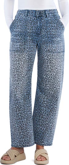 A fierce leopard print enhances the cool vibes of high-waist jeans cut from low-stretch denim in a barrel-leg silhouette.