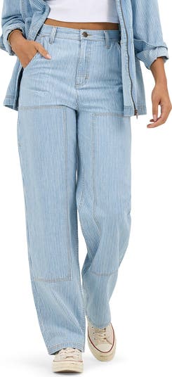 Railroad stripes and reinforced knees play up the workwear-inspired vibe of loose straight-leg carpenter jeans cut from cotton nonstretch denim.
