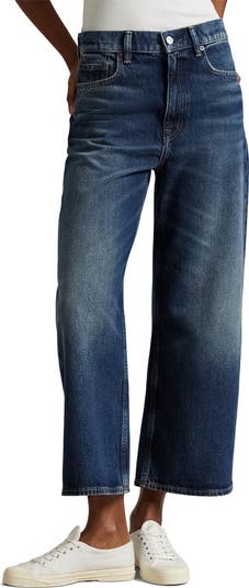 Create a dramatic look any day of the week in these cropped, wide-leg jeans topped with a soaring waist and cast in a faded indigo wash.