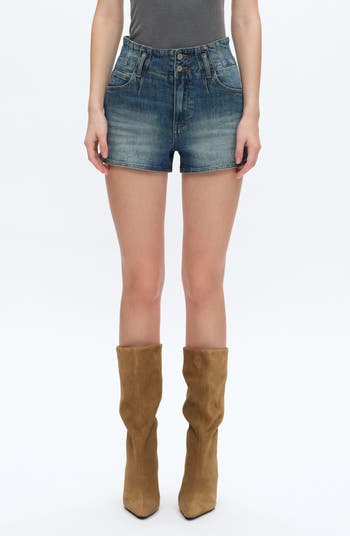 Deep fading adds a lived-in aesthetic to high-rise denim shorts enhanced with a hint of stretch for added comfort.