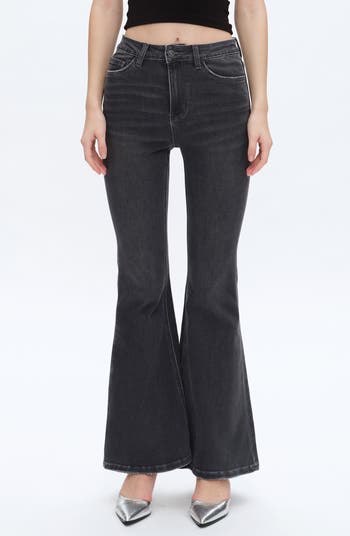 Wide flare legs bring a '70s-inspired aesthetic to these high-waist jeans made from soft stretch denim in a faded dark-grey wash.