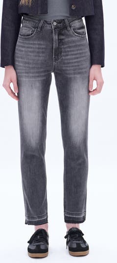 Framed by fraying, released hems for a vintage-inspired look, these stretch-kissed jeans are made with straight legs and deep fading for chic throwback style.