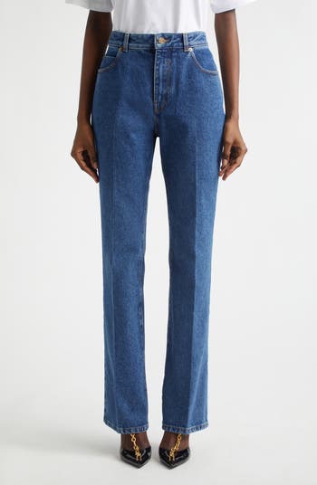 These nonstretch-denim jeans cut with a straight leg are creased for a polished effect and branded with logo embroidery at the back pocket.