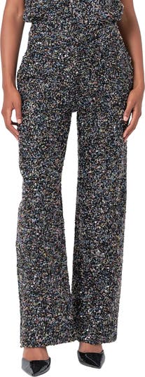 Rock a bold, textural look in bouclé-tweed pants featuring a high waist and wide, full-length legs for a sophisticated silhouette.