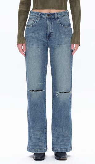 A faded indigo wash lends a playful feel to retro wide-leg jeans made with a high waist and soft, low-stretch denim.