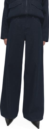 Go casual or elevated in these nonstretch jeans featuring a high waist, full-length wide legs and a dark wash with minimal fading.